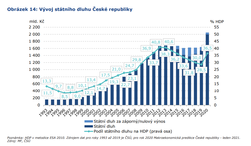 Státní dluh loni stoupl o 410 miliard korun na rekordních 2,05 bilionu korun. Informovalo o tom v pátek ministerstvo financí. Za nárůstem státního dluhu v roce 2020 je zejména vydávání státních dluhopisů, mimo jiné kvůli pokrytí schodku loňského státního rozpočtu, který byl s 367,4 miliardy korun nejvyšší od vzniku Česka. Dluh Česka činí 36,5 procenta HDP, což je v EU čtvrtý nejlepší výsledek. Lépe si vede Estonsko, Bulharsko a Lucembursko. V poměru k HDP na tom byla ČR nejhůře v letech 2012 a 2013.