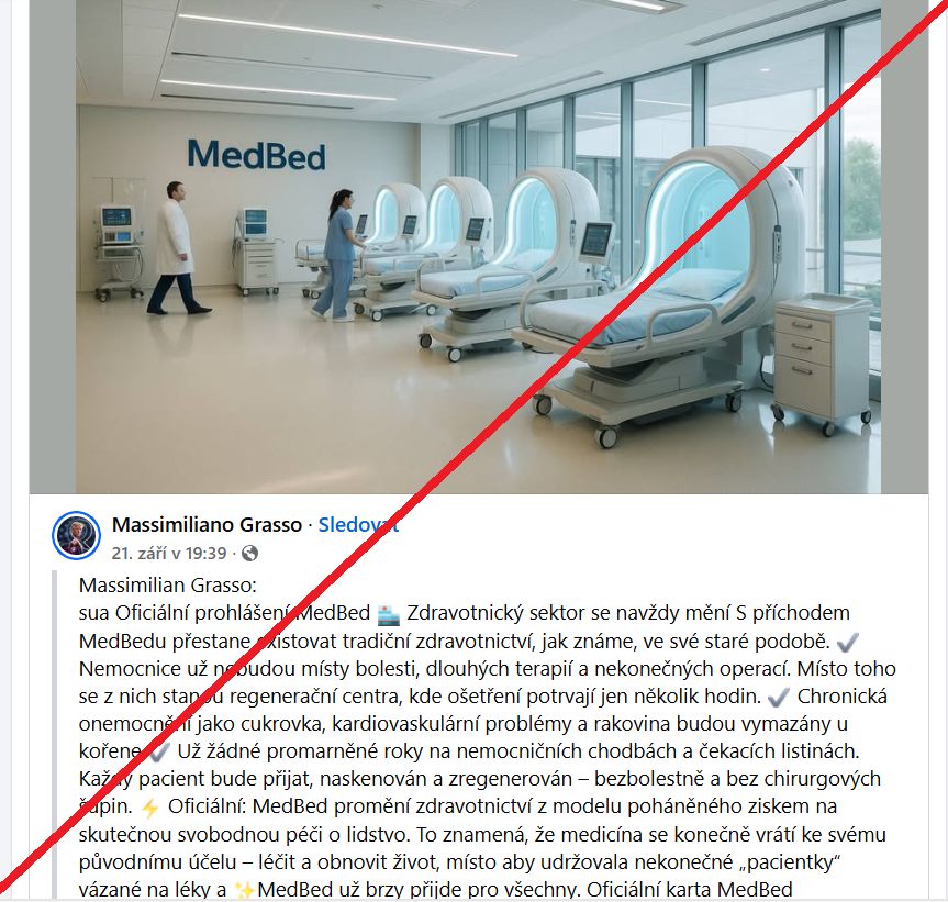 Na sociálních sítích se v posledních týdnech znovu šíří příspěvky, které slibují doslova revoluci ve zdravotnictví. Podle textů sdílených na Facebooku prý „nemocnice MedBed“ vstupují do závěrečné fáze výstavby, jejich infrastruktura je z 98 % hotová, a už brzy se otevřou veřejnosti. Zázračné „léčebné kapsle“ mají umět odstranit všechny choroby – od cukrovky po rakovinu – během několika hodin. Do těchto zařízení má být přístup jen pro držitele „MedBed karty“. Podle některých verzí dokonce vše probíhá pod vedením Donalda Trumpa, který tím údajně mění americké zdravotnictví.